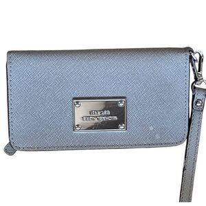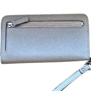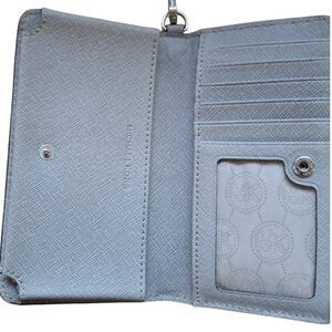 Chic, compact, and versatile—this Michael Kors Jet Set wristlet wallet is crafted in durable saffiano leather in a soft powder blue hue. Features a polished silver-tone logo plaque, secure snap closure, and a removable wristlet strap for hands-free convenience.