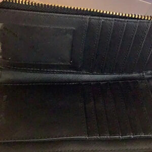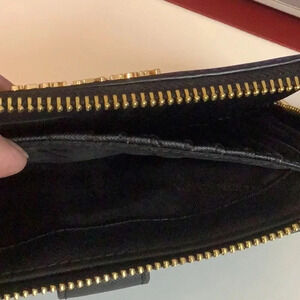 Double sided card slots, gold zipper closure, removable strap. Back slot with flap to hold phone.