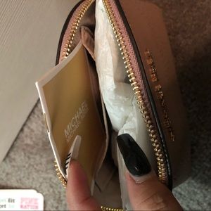 This item is authentic and bought from the Michael Kors store. It is brand new with tags. Has been sitting in my closet so I think it’s time to sell it. The color is kind of a dusty rose light pink with gold accent, as I tried to capture it in the pic.