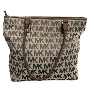 Trendy spacious bag, MK logo print, brown leather trim, gold hardware, MK medallion, double handle, zip closure