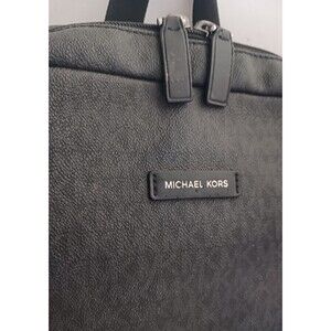 The Michael Kors Jetset Large Backbag is a stylish backpack featuring a black and gray MK logo print on coated canvas material that has a textured saffiano leather look. It has a zip closure, a front zippered pocket ,a lined interior with inner pockets, a 12" tablet/laptop sleeve space, adjustable straps, and is stain-resistant . This designer backpack is perfect for a city-themed look, providing both fashion and functionality for everyday use. Overall size 15"H X3"D(5"D with the front pocket) X11.5" W . Pre owned, clean inside and out, looks great.