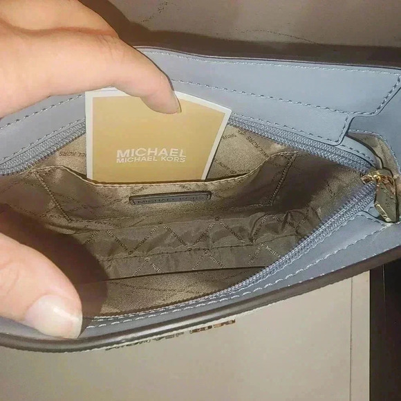 The bag also comes with a coin purse and features hardware in gray, white, and blue. The interior is lined with beige fabric and has enough space for all your essentials. This handmade bag is part of the Michael Kors Jet Set product line, and is designed with a monogram pattern. The bag is perfect for women who are looking for a stylish and functional accessory.