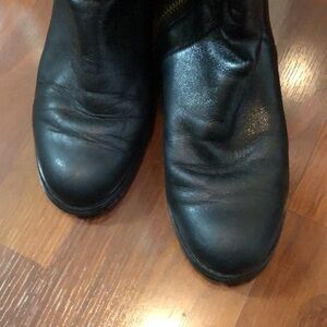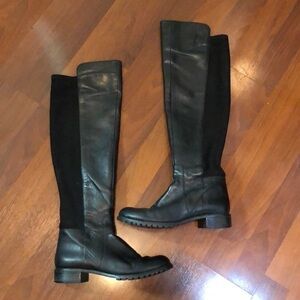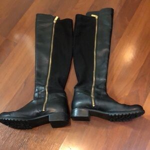 Overall very good condition some creasing on the toe. Tall black leather zip up over the knee boots and stretchy fabric back