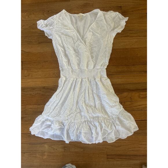 White eyelet lace Flutter sleeve dress with Smocked waist and crossover top. V neck. MICHAEL Michael Kors