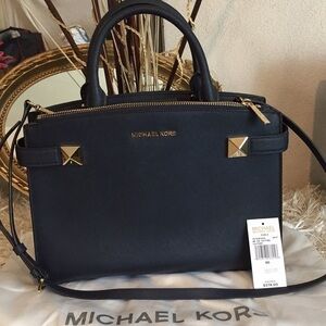 Exterior design details: gold-tone hardware; gold side zipper pocket and stud embellishment.