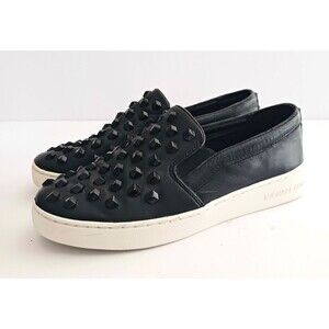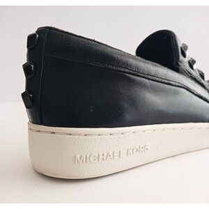 Elevate your shoe game with these Michael Kors Keaton slip-on sneakers. Crafted from black leather with raised black studded accents, these sneakers feature a round toe and a white rubber bumper, slip-on closure for easy wear. The rubber outsole provides cushioned comfort, making them perfect for all-day wear. These designer flats are perfect for women who love to stay stylish while keeping things comfortable. The Michael Kors brand is known for its quality and attention to detail, making these sneakers a must-have for any fashion-forward wardrobe. Sz 6M. Excellent pre owned condition, clean, they look great.