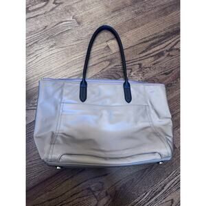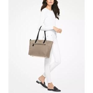 EUC like new. Tan nylon Michael Kors Kelsey tote with gold-tone hardware, dual flat shoulder straps, tonal Saffiano leather trim, dual exterior pockets; one with zip closure, tonal nylon lining, four pockets at interior walls; one with zip closure and zip closure at top.