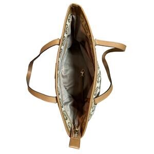 Tan saffiano leather bottom, straps and trim