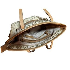Beige fabric with MK circle logo design in tan/camel