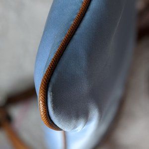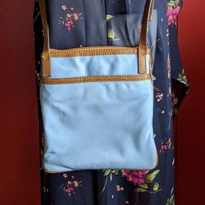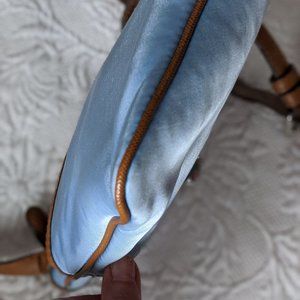 Michael Kors - Kempton small nylon and leather crossbody bag. Shimmery sky blue nylon exterior, tan leather trim, slightly darker blue nylon interior. Silver hardware. Two interior slip pockets, one slip pocket on reverse, zip pocket on front, zipper closure