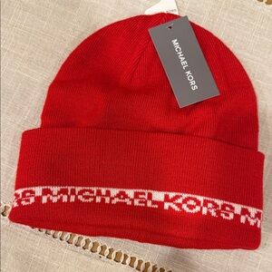 Vibrant red knit hat for kids. Features iconic logo detail. Stylish and cozy.