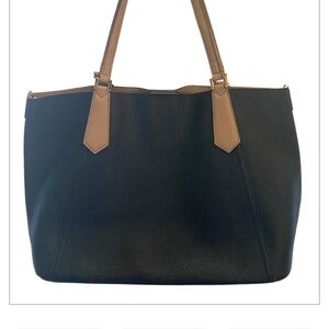 Magnetic snap closure, dual leather straps with approximately 8” drop, slip pocket on the interior, measurements: approximately 16” at the top tapering to 12” at the bottom. Height is approximately 11”, Width is 5”.