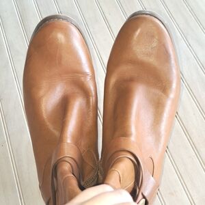 Genuine soft Leather with gold accessories. Zips on the side. 1.5" heel. Still in good shape.