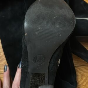 Step out in style with these elegant suede black Michael Kors knee-high boots with silver inner zipper. Perfect for any occasion, these boots offer both comfort and sophistication. Great condition.
