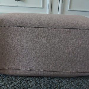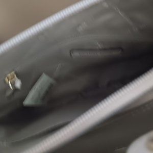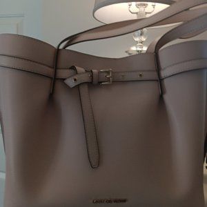 Tote has snap top closure with middle zipper compartment and inside pockets.