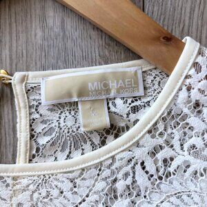 MICHAEL Michael Kors ivory white lace blouse in great condition. The blouse is made of a sheer floral lace and has a lining underneath the torso area, while the sleeves remain unlined and transparent. Beautiful top for date nights or the holidays!