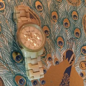 Ladies' gold-plated stainless steel 36mm Michael Kors Ritz Horn Watch with mineral crystal, engraved bezel, mother of pearl dial, three sub dials, crystal hour markers, luminous sword hands and stick sweeping seconds hand, fluted push and pull crown, water resistant up to 100 meters, creme horn link bracelet and deployant closure.
