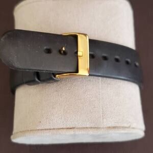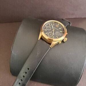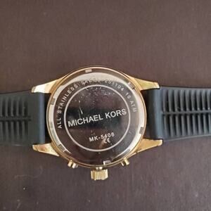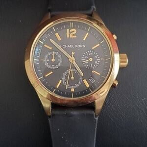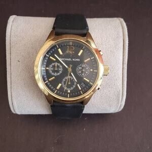 Michael Kors Gold Tone Chronograph watch with black silicone band. Shows minor wear with a scratch on the crystal near 12:00 but still lots of life left. Currently running with a fresh battery.