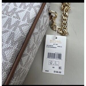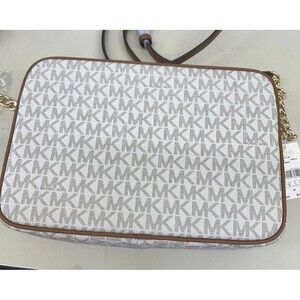 The Michael Kors Ladies Vanilla Signature-coated Jet Set Large East West Crossbody is a stylish and practical accessory designed for women. Made of leather with a signature logo pattern, this small-sized crossbody features a zipper closure and an adjustable chain strap for added convenience. The exterior color in vanilla complements the classic theme of the design, making it a versatile and trendy choice for everyday use. Perfect for carrying essentials in a fashionable way, this Michael Kors crossbody is a must-have for any woman looking for a chic and timeless accessory.