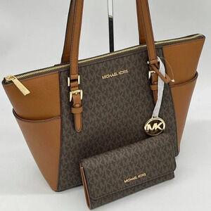 Michael Kors Large Charlotte Tote Bag & Large Trifold Wallet Brown