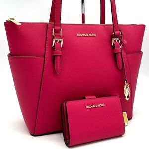 Michael Kors Large Charlotte Tote Bag & MD Bifold Zip Chain Wallet Electric Pink