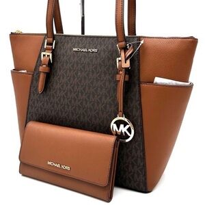 Michael Kors Large Charlotte Tote Bag & Matching Trifold Wallet Luggage/Brown