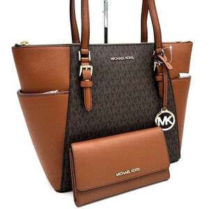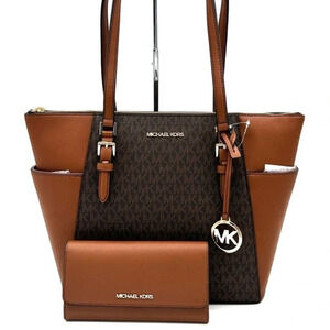 Michael Kors Large Charlotte Tote Bag & Trifold Wallet Luggage Brown Set