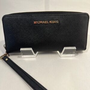 Michael Kors large Continental wristlet in black leather with interior zipper compartment, card holder and bill slots