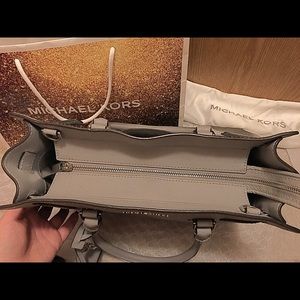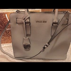 Beautiful Pearl Gray. Large Dillon satchel, can be worn as a crossbody or over your arm. Pocket on the outside is perfect for your cell phone. Has a zippered pocket and 4 smaller pockets on the inside, as well as an attached keychain finder. Zips closed. EUC, however the inside does have one minor spot from normal use. Originally paid over $350. Just don't use it anymore.