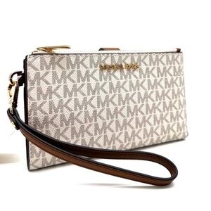 Brand New with Tag 100% Authentic❗️ Don't be afraid to make an offer❗️ Outlet Style NWT Michael Kors Jet Set travel double zip wristlet, wallet, clutch Color: Vanilla PVC and Saffiano leather Brown color with gold hardware 6 credit card holders 1 D hoder 2 slip compartments 2 zip pockets a phone holder slot and a large bill section accessible from the side 7.25" × 4.25" x 1" Comes with a detachable wrist strap Let me know if you have any questions or concerns, ALL items are 100% authentic with 1-2 day shipping BUNDLE DEALS! FREE SHIPPING AND MORE❗️