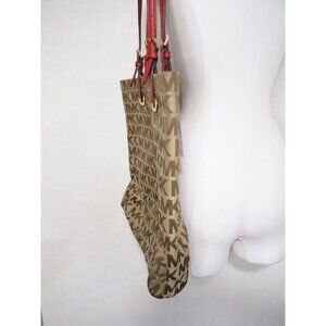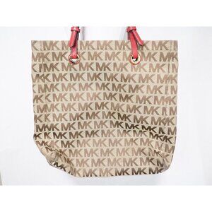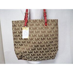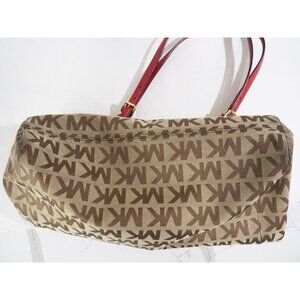 Michael Kors Large Gold & Brown Logo Embroidered Tote Bag Red Leather Handles