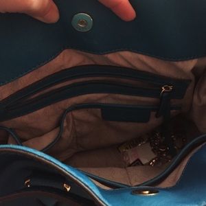 Beautiful teal tote. Excellent condition -14" x 13" x 6.25. // Magnetic fastening // Two Top Handles, Leather Shoulder Strap