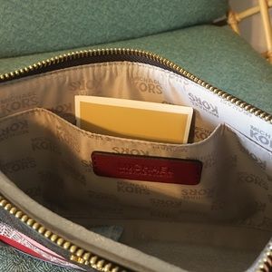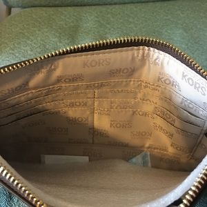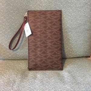 Michael Kors Large Heart Zip Clutch in Brown/Cherry. BNWT. 6 credit card slots on one side. Open pocket on the other side.