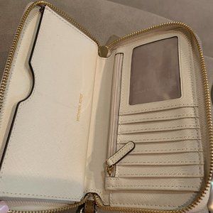 NWOT Vanilla Color, Logo-print leather, gold tone zip around, with a leather drop handle. Has a ID window, card slots and compartment for phone. Measures at 7"W X 4"H X 1"D.