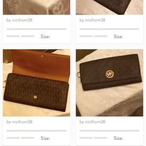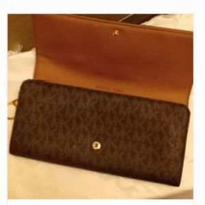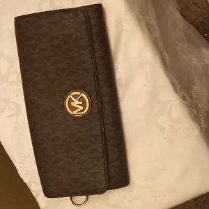 Excellent like new condition official Michael Kors Wallet. Large MK logo on front, dark brown w/ light brown MK all over it. 5 sections;for cards,bills,coins and receipts.