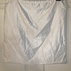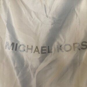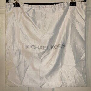 White, drawstring close, dust bag by Michael Kors. Square shaped bag that features MICHEAL KORS in sparkly, silver text. Has a soft, satin like texture. Michael Kors describes the item as follows, "Our logo dust bag is an essential for safely storing your most-loved handbags. Whether you’re packing for a getaway or rotating seasonal items, it will keep your shoulder bags, satchels and more free of scratches."