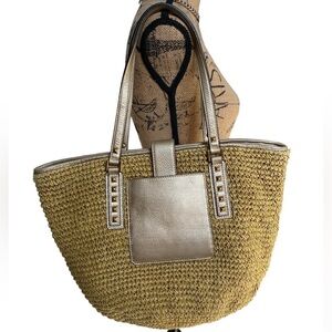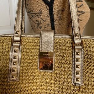 Michael Kors Large Raffia Shoulder Shopper Beach Tote Leather Handles Metal Stud