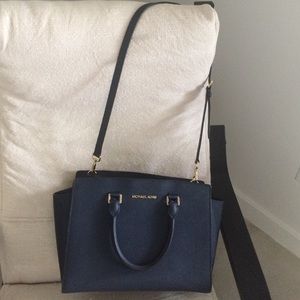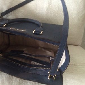 Dark blue leather satchel. Gold hardware. Zipper closure. Double top handles with 5" drop. Adjustable long strap with 22" drop.