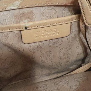 Listed is a large MK signature tote bag in very good condition. There are no marks, rips or tears on the outside and only one small spot in the interior. Straps have some light wear. The bag measures 11"h x 18"w x 6" d. Great bag for day trips, commuting or travel. Inside has a full zippered middle pocket and several other pockets (see photos) as well as a key strap.