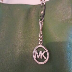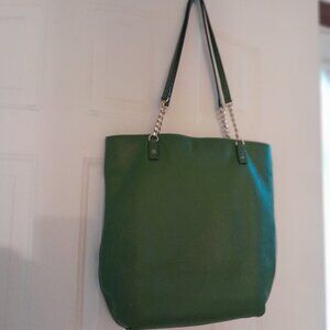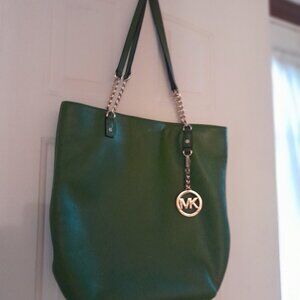 Michaei Kors great roomy leather bag with chain detail on straps. Bag measures 12"h x 13"w x 2 1/2"d. Strap drop is 11". Bag is in great condition with no wear marks on bag or straps. Inside has1zippered and 4 various size open pockets. Snap closure.