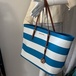 This is a beautiful Michael Kors Large Teal White Striped Jet Coated Canvas Tote Shoulder Bag. Excellent condition. Carried once. Super tiny scuffs mostly from storage. Brown leather straps. Coated Canvas. 18” x 11” x 7” with 9” straps.