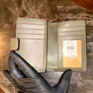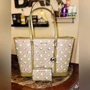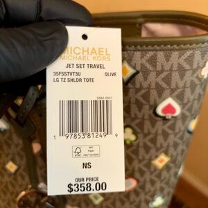 Brand new with tags! This eye-catching Michael Kors large tote and matching wallet set is a must-have. The olive green tote features a bold, playful print of hearts, clubs, diamonds, and spades. Which is channeling major Vegas vibes. Finished with silver-tone hardware for a sleek, stylish touch.
