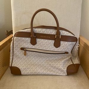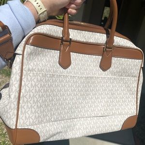 Beautiful, white, Michael Kors large weekender bag with shoulder strap. Barely used, great for carryon, has a suitcase handle on back for easy travel.