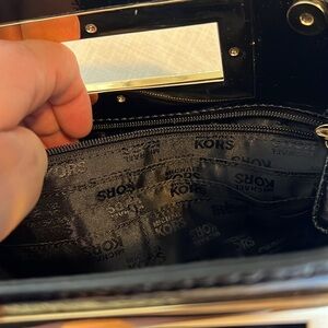 Michael Kors Berkley Clutch - Genuine Shiny Black Leather with Gold detail handles, magnetic snaps, interior compartments for cards. 1 zippered pocket and 1 open pocked. In excellent condition