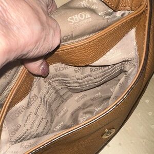 Elegant Michael Kors crossbody in leather. Features adjustable strap and tassel detail. Perfect for daily wear. Has gold tone hardware backside has one large slip envelope pocket with magnetic snap closure front side has fold over top with snap closure on that flat has large center section very deep inside has two slip pockets on one side next section has eight card slots. Lots of space for all your needs very nice pebble leather beautiful tassel corners are good handle is good. Only used a few times removable Crossbody strap and a nonremovable ,chain and leather handle with