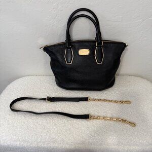 This is a gorgeous bag with the softest leather. It has a detachable chain. You can wear it as a crossbody. It is elegant and can easily go from day to night. It can fit a lot in it so great for traveling.