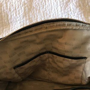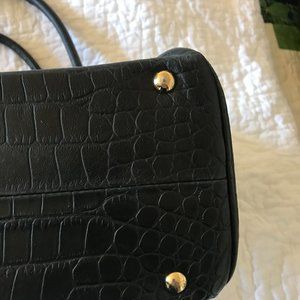 Black embossed leather satchel with spacious interior. Exterior is croc-embossed leather with removable cross-body strap and MK Logo charm. Interior features logoed canvas with zip and open pockets. Large enough to fit a tablet or small laptop. Bag measures 13.5"W x 10"H x 5" depth