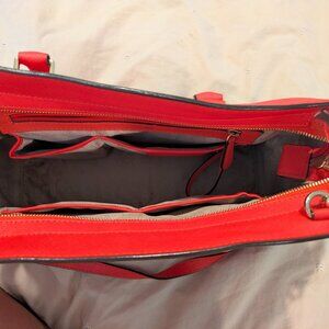 A structured leather tote with clean lines, gold-tone hardware, and dual top handles, designed with a detachable crossbody strap for versatile wear. The bright poppy color has stood the test of time. This bag has been used but is in great shape structurally. There may be some barely noticeable marks, but you can see them in the photo.