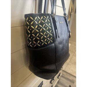Seller notes: Great bag for everyday use! Lots of room and beautiful gold accents! Condition, needs to be cleaned inside. A few of the gold accents are missing but it is hardly noticeable when carrying the bag. A few scuff marks and leather wear from general use. See pictures for references.