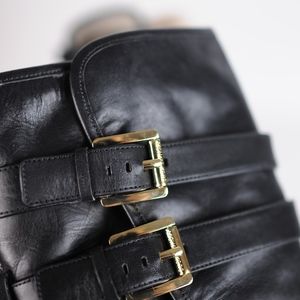 Michael Kors Leather and Shearling-lined "MAE" boot. Slide on style with gold logo buckles. Heel 5.5", front platform is 1". Worn once, upper in perfect condition, sole has very slight wear. Box included. These are HOT!! Size 10. Will consider all reasonable offers!